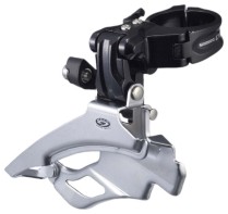 Deragliatore per guarnitura tripla 10V. Compatibile con tiraggio del cavo dall'alto (Top Pull) e dal basso (Down Pull). Disponibile con attacco a fascetta bassa (Top Swing) oppure a fascetta alta (Down Swing). Compatibile con tutti i diametri (34,9 - 31,8 e 28,6 mm.), tramite appositi riduttori forniti in dotazione. Corpo anodizzato nero, con forcella cromata. Corona massima: 44 denti. Capacità: 22 denti. Pesi: 162 gr. (Top Swing).