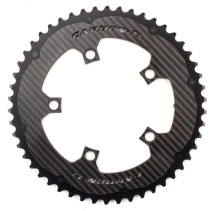 Corona realizzata in carbonio con denti in Ergal 7075, anodizzati neri. Compatibili con tutte le guarniture compatte 10/11V e giro bulloni da 110 mm. (escluso Campagnolo). La fibra di carbonio riduce al minimo il peso aumentando la rigidità delle corone e quindi la precisione di cambiata. I denti in Ergal 7075 assicurano un'usura pari alle normali corone. Cambiate perfette grazie ai piolini di aggangio per la catena, realizzati in titanio. Lavorazione in autoclave. Dentature disponibili: 34, 36, 39, 50, 52, 53 denti. Pesi: 28 gr. (34 denti) - 80 gr. (50 denti).