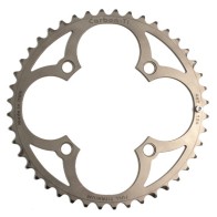 Corona realizzata in Titanio 6Al/4V a 4 fori, per guarnitura doppia 10V. Durata superiore alle normali corone in alluminio. Giro bulloni standard da 104/64 mm. oppure da 120/80 mm. (SRAM XX, X0). Dentature disponibili: 22, 24, 25, 26, 28, 36, 38, 40, 42 denti. Peso: da 17 gr. (22 denti) a 64 gr. (42 denti).