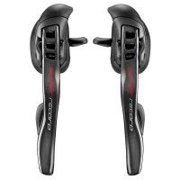 Comandi Ergopower a 12 velocità, compatibili con guarnitura doppia. Corpo e pulsante in composito. Leva freno in carbonio, alleggerita tramite 3 asolature, con distanza dal manubrio regolabile in 2 posizioni. Leva interna in fibra di carbonio. Movimento su cuscinetti. Meccanismo di cambiata Ultra-Shift, con differenziazione del numero massimo di scatti in salita in base al pignone di partenza: fino a 3 rapporti in salita e fino a 5 pignoni in scalata. Microregolazione del deragliatore. Comando apertura freni integrato nelle leve. Meccanismo interno e minuteria in titanio. Forniti con cavi e guaine per freni/cambio/deragliatore, disponibili nei colori nero, rosso e bianco. Peso coppia: 339 gr. Garanzia: 3 anni.