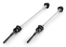 Coppia di bloccaggi rapidi, con assali in titanio, leve in carbonio e dadi ed innesto leve in Ergal 7075-T6. Misure: 100 mm. (ant.) / 130 mm. (post.). Specifici per ruote da strada tradizionali (no disc). Colore: nero. Peso coppia: 42 gr.