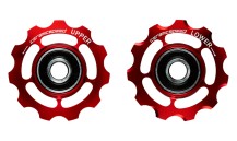 Coppia pulegge ad 11 denti, realizzate in Ergal 7075, disponibili per Shimano, SRAM e Campagnolo. Movimento su cuscinetti ceramici di altissima qualitą: le sfere ceramiche utilizzate hanno superficie 100% pił liscia e sono il 15% pił dure rispetto ad altre sfere ceramiche in commercio (con una durata da 3 a 5 volte superiore). Colori disponibili: nero, argento e rosso. Peso coppia: 18 gr.