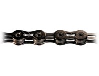 Catena per gruppi strada Campagnolo, Shimano e SRAM ad 11 velocità. Piolini forati e maglie interne alleggerite. Maglie esterne alleggerite, con trattamento superficiale ad alta durezza DLC (Diamond Lile Coating), per massima scorrevolezza e resistenza a corrosione. Fornita con 2 connettori di chiusura a falsa maglia Missing Link di colore nero, per apertura e chiusura catena senza attrezzi. Completamente nera. Peso: 237 gr. (114 maglie).