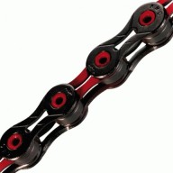 Catena per gruppi strada Campagnolo, Shimano e SRAM ad 11 velocità. Piolini forati e maglie interne alleggerite di colore rosso. Maglie esterne alleggerite di colore nero, con trattamento superficiale ad alta durezza DLC (Diamond Lile Coating), per massima scorrevolezza e resistenza a corrosione. Fornita con 2 connettori di chiusura a falsa maglia Missing Link di colore nero, per apertura e chiusura catena senza attrezzi. Peso: 237 gr. (114 maglie).