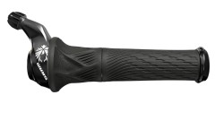 Comando cambio a rotore a 12V. Tecnologia di cambiata X-Actuation, specifica per gruppi SRAM Eagle monocorona. Meccanismo di cambiata shift indexing completamente in metallo. Fornito con cavo e manopola integrata Jaws Lock-On Grip. Anodizzazione nera. Peso: 144 gr. (con cavo e manopola).