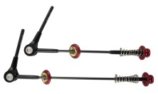 Coppia di bloccaggi rapidi, realizzati in carbonio ed ergal. Assali e leve di chiusura in carbonio. Dadi ed innesto leva di chiusura in ergal. Misure: 100 mm. (ant.) / 130 mm. (post.). Colore: leve nere, con dadi rossi. Specifici per ruote da strada tradizionali (no disc). Peso coppia: 28 gr.