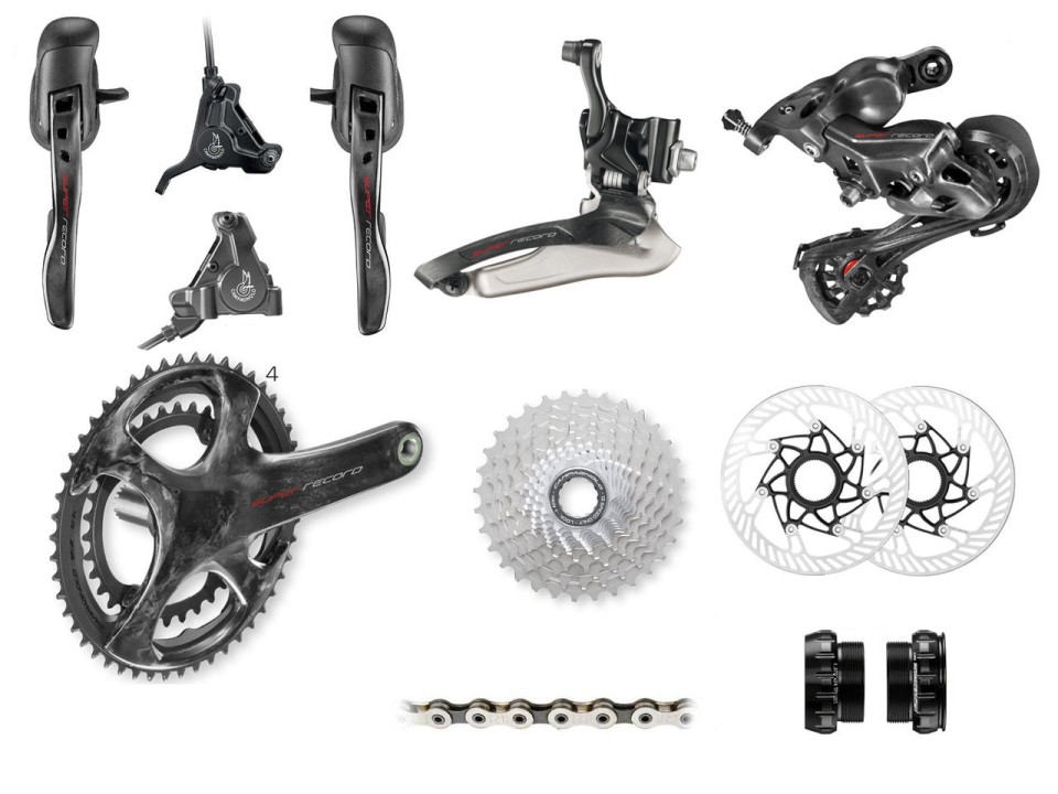 - comandi Super Record Ergopower Ultra-Shift 12V con cavi/guaine per freni/trasmissione (in versione idraulica per freni a disco, con cavi/guaine per trasmissioni e tubi/olio per freni);