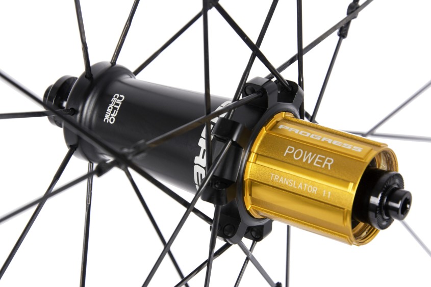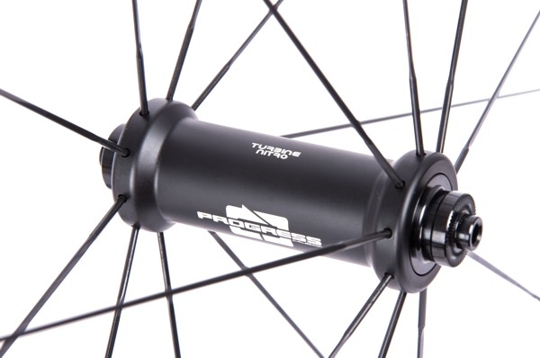 Mozzi Progress Turbine Nitro Ceramic anodizzati neri, con 18 raggi anteriori e 24 posteriori (16 lato cassetta ed 8 lato opposto).