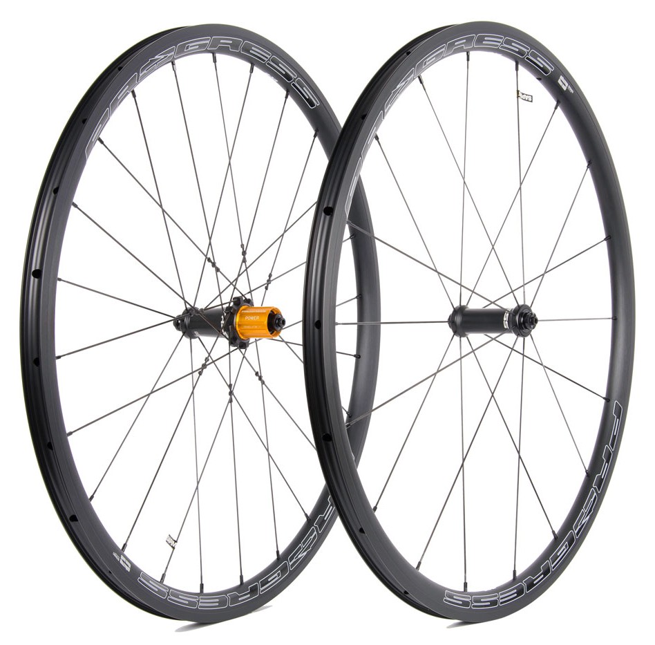 Mozzi Progress Nitro Ceramic anodizzati neri, con 18 raggi anteriori e 24 posteriori (16 lato cassetta ed 8 lato opposto).