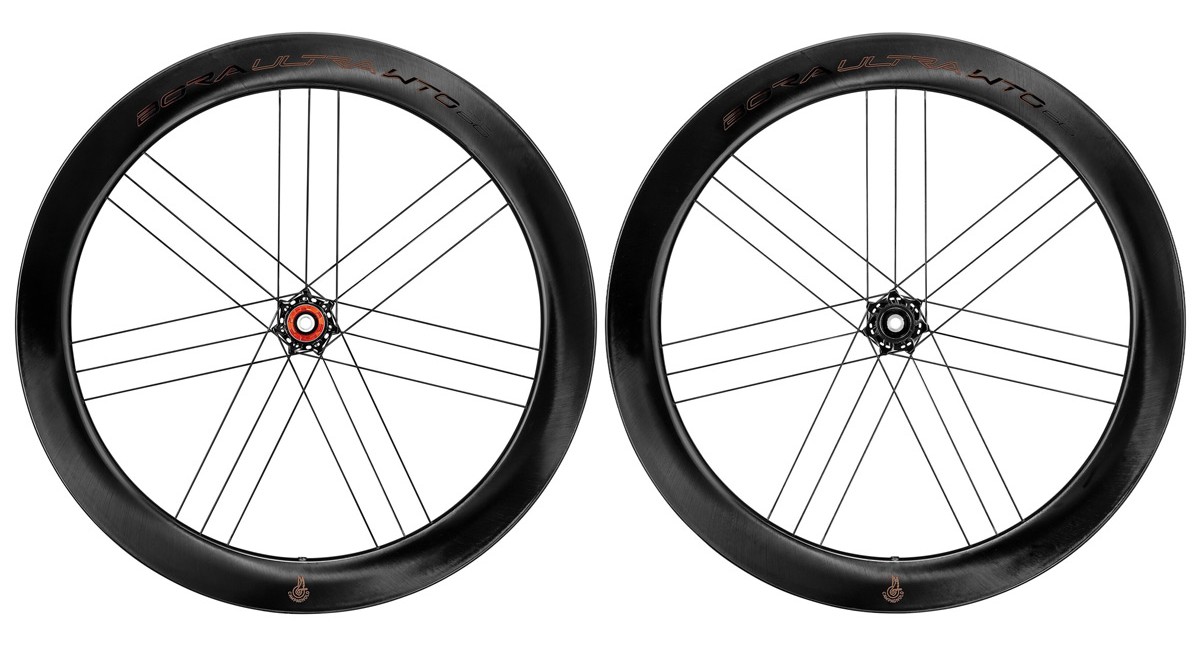 Coppia ruote con cerchi in carbonio Hand Made Ultra-Light Carbon (H.U.L.C.) ad alto profilo, per copertoni e freni a disco.