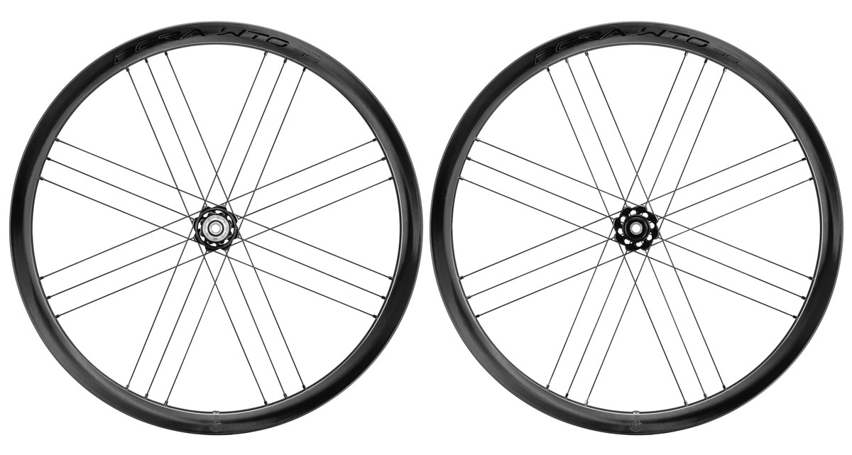 Coppia ruote con cerchi in carbonio Hand Made Ultra-Light Carbon (H.U.L.C.) a medio profilo, per copertoni e freni a disco.