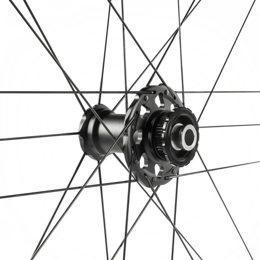 Mozzi interamente in alluminio, flangia oversize Mega G3 e movimento su cuscinetti in acciaio, con sistema cono/calotte e microregolazione del gioco: anteriore per assale passante 12x100 mm., posteriore per assale passante 12x142 mm.