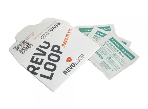 Kit composto da 3 pezzuole imbevute di alcol per la pulizia e 3 toppe adesive per la riparazione delle camere d'aria Revoloop.
