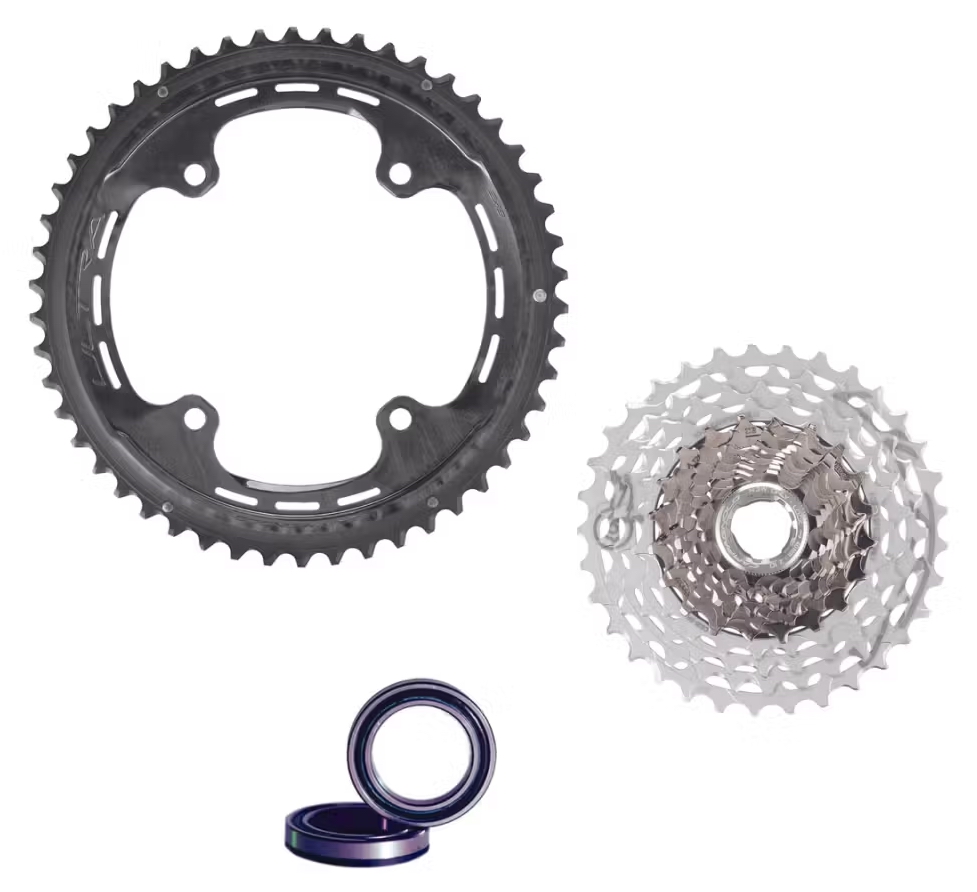 Peso: 78 gr. (corona 50 denti) + 215 gr. (pignoni 10-33 denti) + 49 gr. (cuscinetti).
